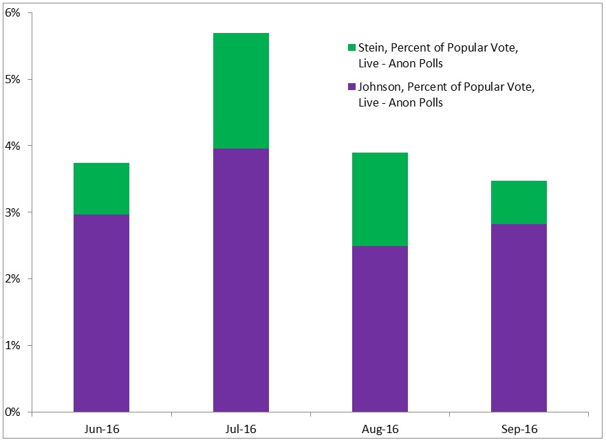 Measuring Social Desirability Bias is rather straight-forward. Live polls contain an element of social pressure as a live interviewer conducts them. Anonymous polls, relying on robocalls, IVR, and internet collection, contain less social pressure. The difference between these two provides us our bias rating. The following chart shows the bias for Johnson and Stein from June to September, which is the entire data series of acceptable data.