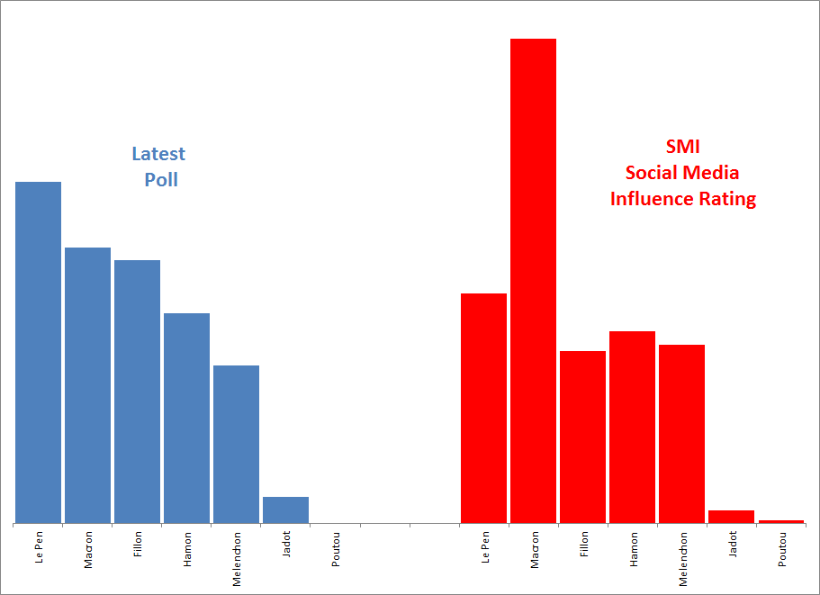 Chart 1: 2017 French Presidential Election Poll Results versus Social Media Influence (SMI) Ratings for the main candidates
